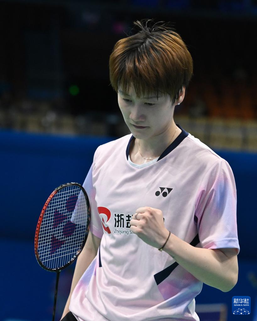 11月11日,浙江队选手陈雨菲在女单比赛中庆祝。她2比0战胜江苏队选手高昉洁。