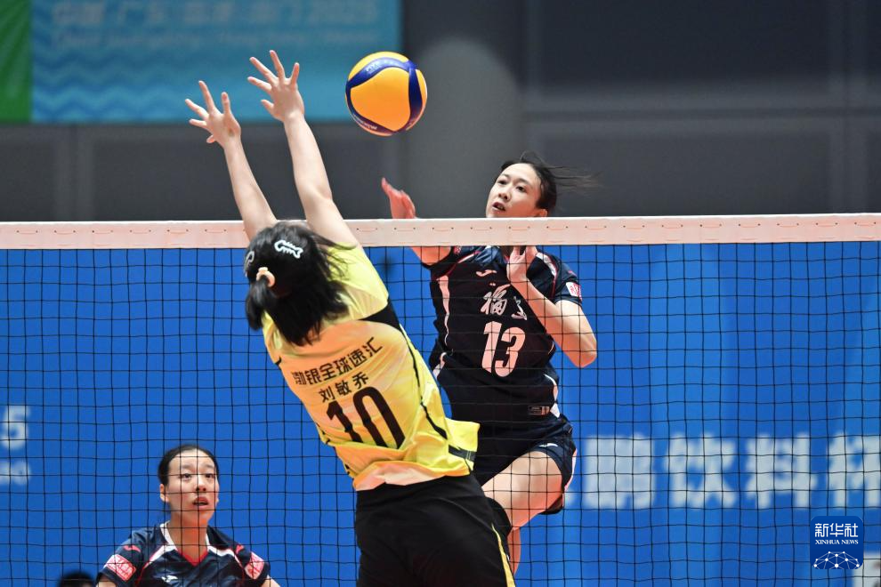11月11日,福建队球员李宇珊(右)在比赛中扣球。
