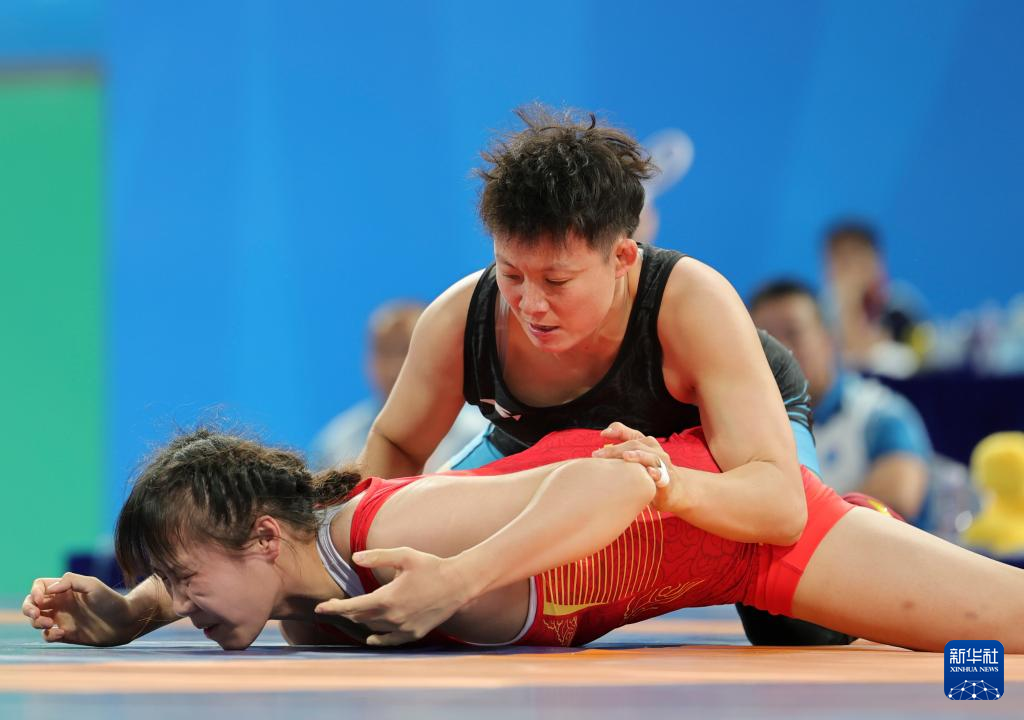11月10日,辽宁队选手罗晓娟(上)与江西队选手饶余琪在女子自由式62公斤级铜牌赛中。最终,罗晓娟战胜饶余琪,获得季军。