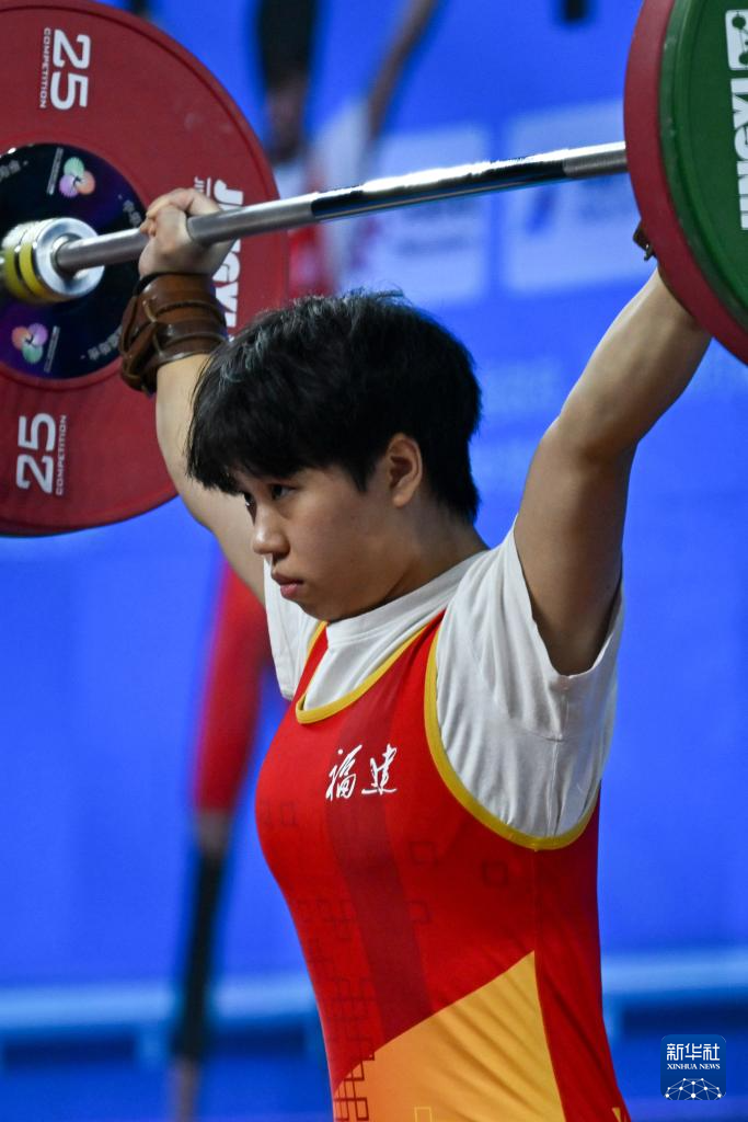 11月11日,福建队选手魏婷娜在抓举比赛中。她最终夺得冠军。