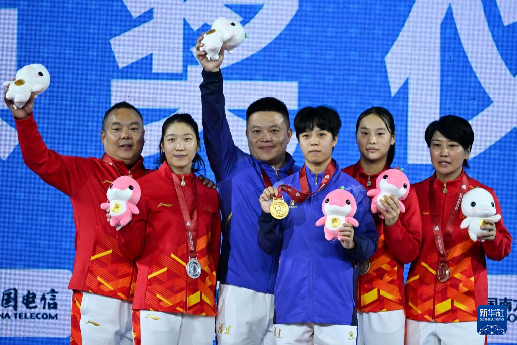 11月11日,获得冠军的福建队选手魏婷娜(右三)、获得亚军的重庆队选手苏婷婷(左二)、获得季军的重庆队选手刘梦佳(右二)在颁奖仪式上与教练合影。