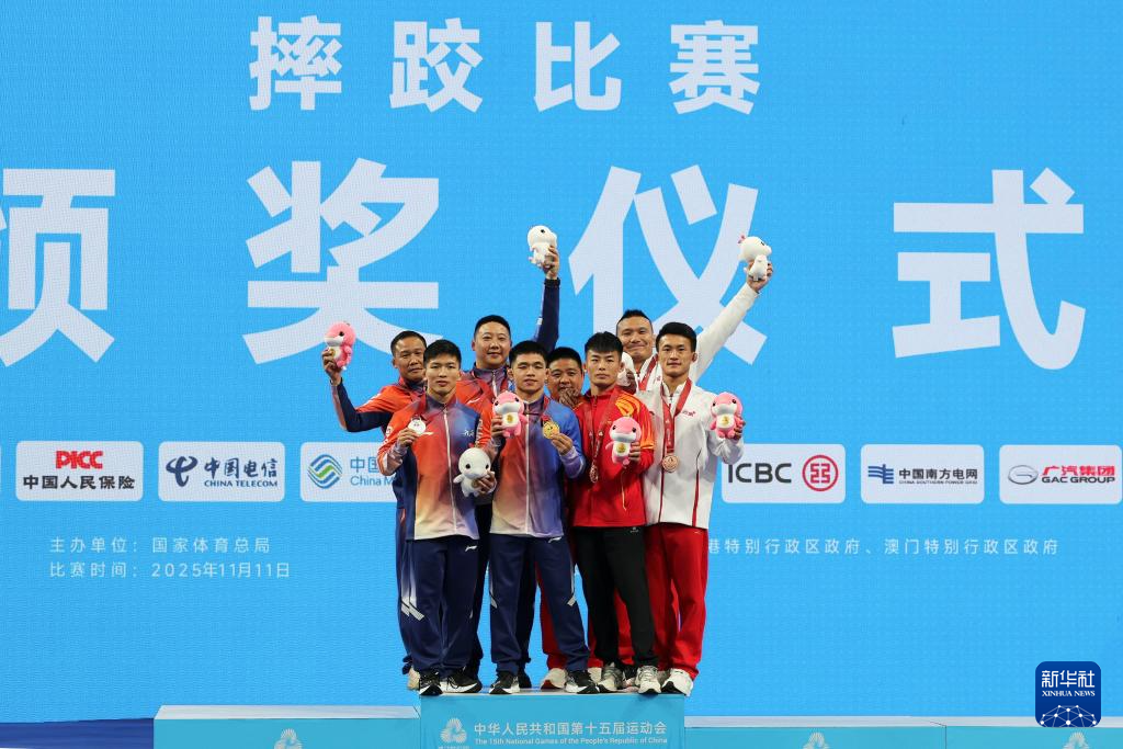 11月11日,获得冠军的广西队选手邹万豪(左四)、获得亚军的广西队选手刘明瑚(左二)、获得季军的江西队选手李威宇(右三)、获得季军的云南队选手白继亮(右一)和教练在颁奖仪式上合影。