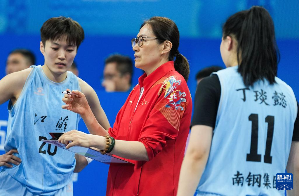 11月11日,江苏队主教练陈生萍(中)在比赛间隙布置战术。