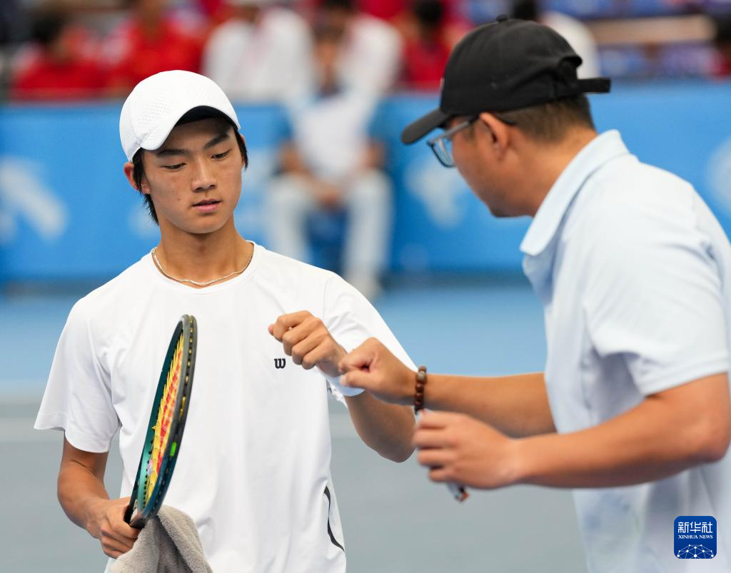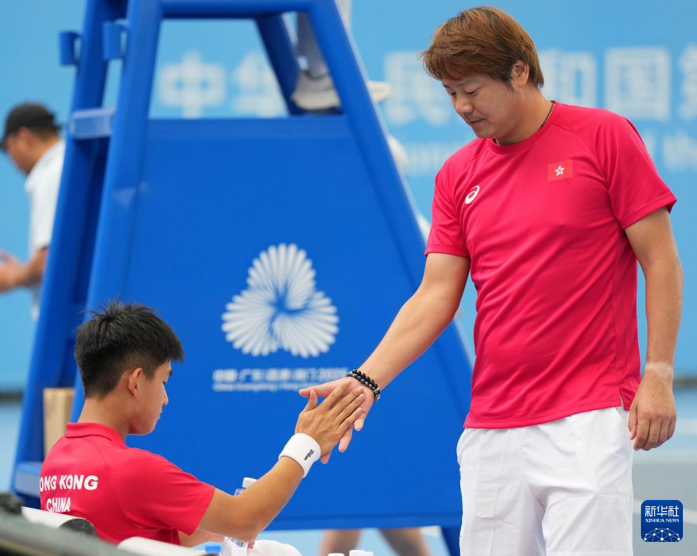 11月11日,香港队选手程铭燦(左)在比赛间隙与教练刘进鉴击掌加油。