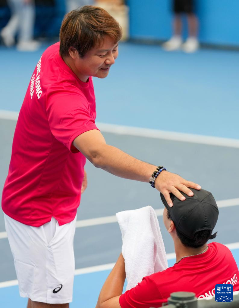 11月11日,香港队教练刘进鉴(左)在比赛间隙鼓励选手郑肇致。
