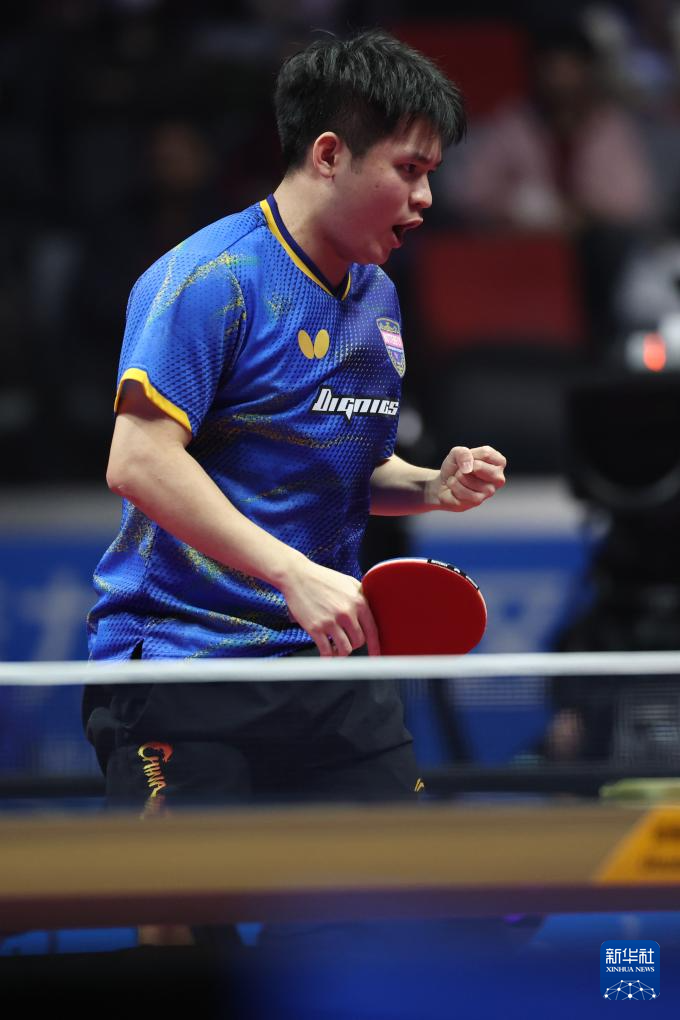 11月11日,海南队选手林诗栋在比赛中庆祝得分。