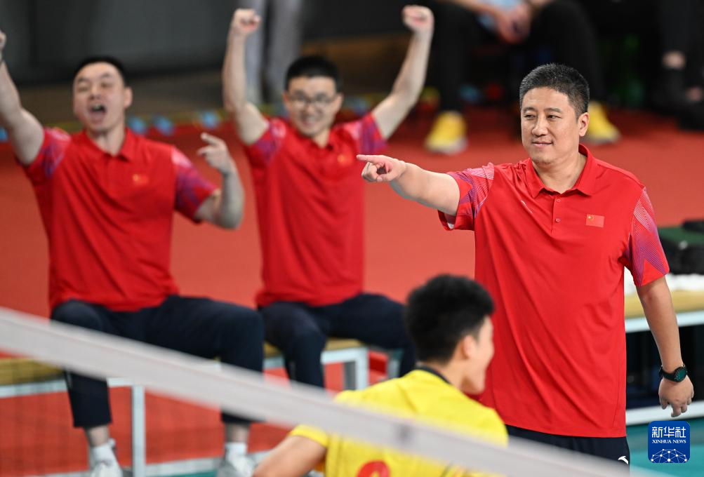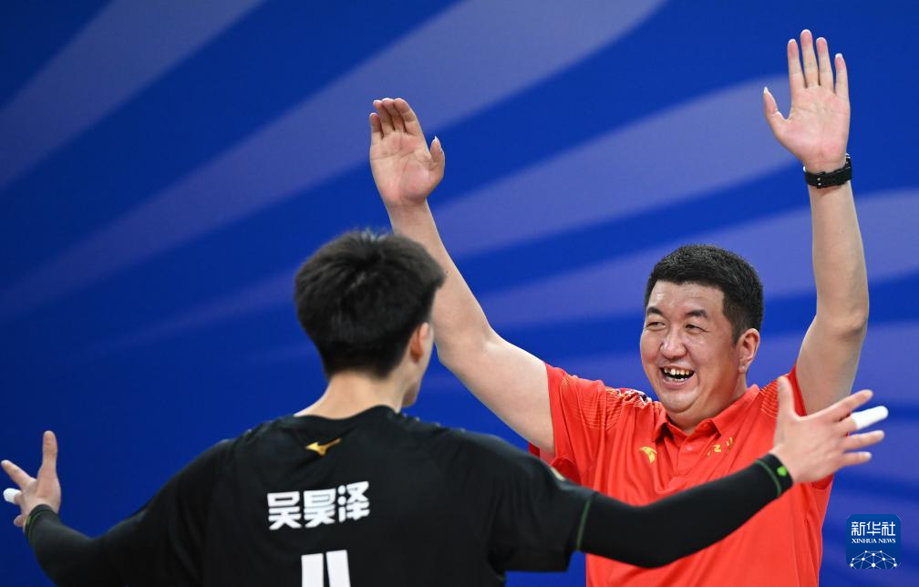 11月11日,山东队主教练张震宇(右一)在比赛中庆祝得分。