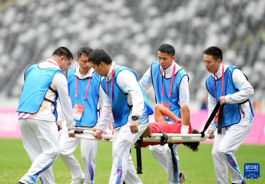 11月11日,河北队球员丁天琦受伤后被担架抬出场外。