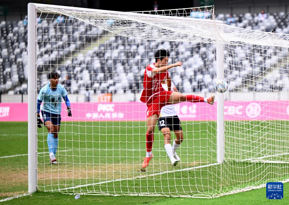 11月11日,河北队球员陈天乐(右二)在比赛中射门得分。