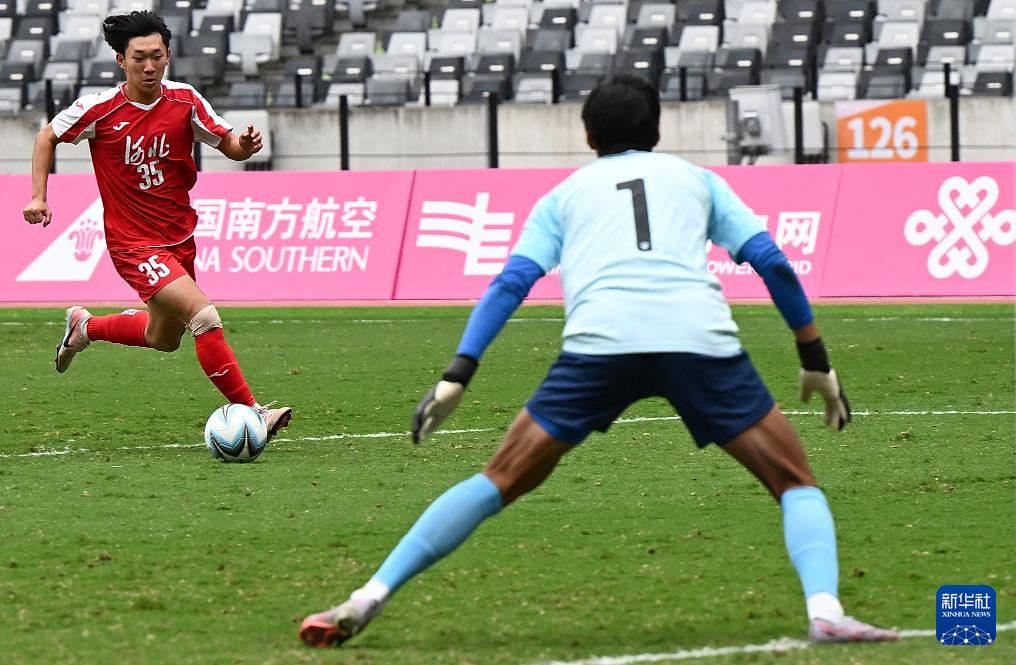 11月11日,河北队球员陈天乐(左上)在比赛中射门。