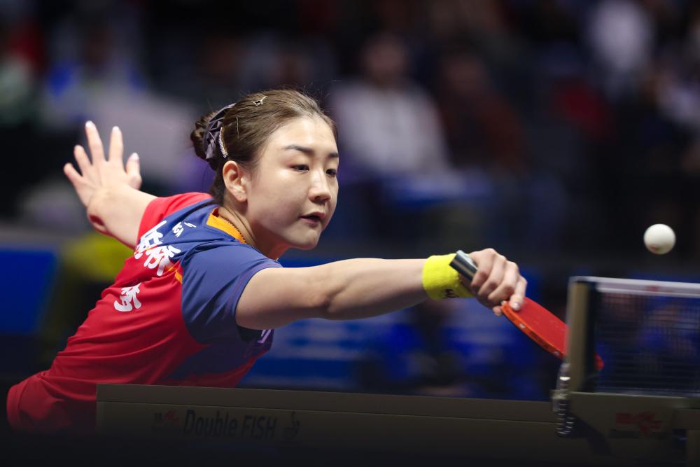2025年11月11日,陈梦在第十五届全国运动会乒乓球女子单打1/16决赛中回球。新华社记者 刘续 摄