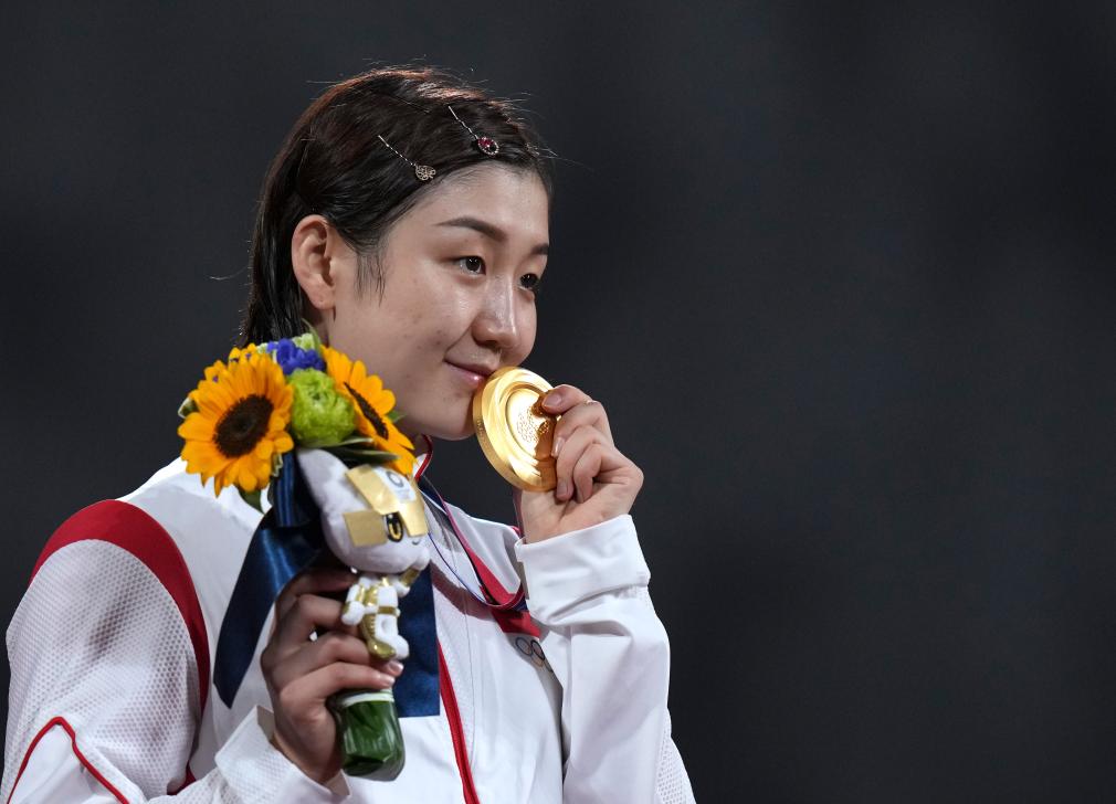 2021年7月29日,陈梦在东京奥运会乒乓球女单颁奖典礼上亲吻金牌。新华社记者 吕小炜 摄