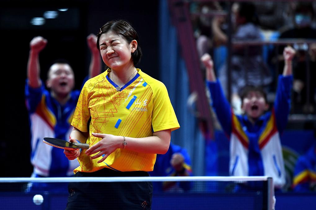 2021年9月21日,陈梦在第十四届全运会乒乓球女子团体决赛中。山东队1比3不敌辽宁队,获得亚军。新华社记者 李安 摄