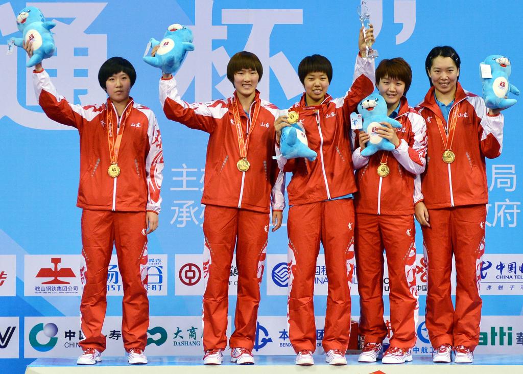 2013年9月5日,冠军山东队在第十二届全国运动会乒乓球女子团体颁奖仪式上。新华社记者 朱峥 摄