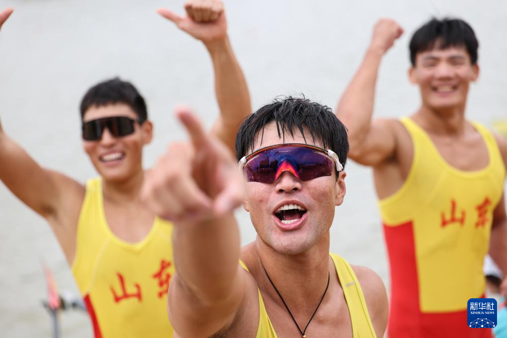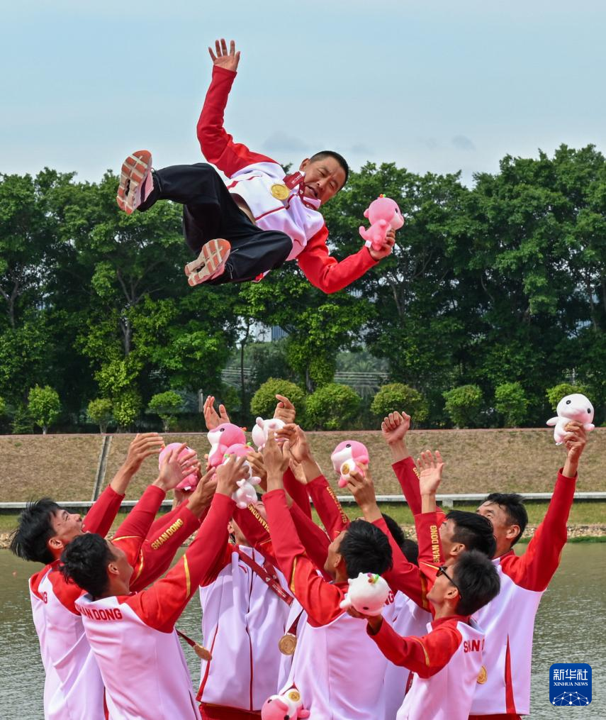 11月11日,山东队选手(后艇)在比赛后庆祝夺冠。