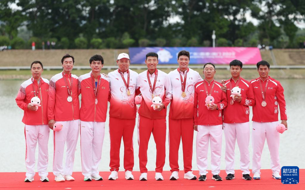 11月11日,获得冠军的广东队选手倪旭林(右四)/聂毅德(中)、获得亚军的湖南队选手伊绪帝(左三)/张亮(左二)、获得季军的贵州队选手赵超(右一)/李林富(右二)和教练在颁奖仪式上合影。