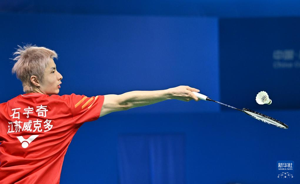 11月12日,江苏队选手石宇奇在男单比赛中回球。最终,他2比0战胜湖南队选手王正行。