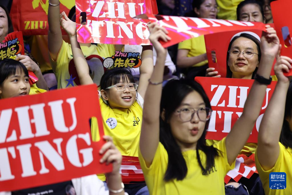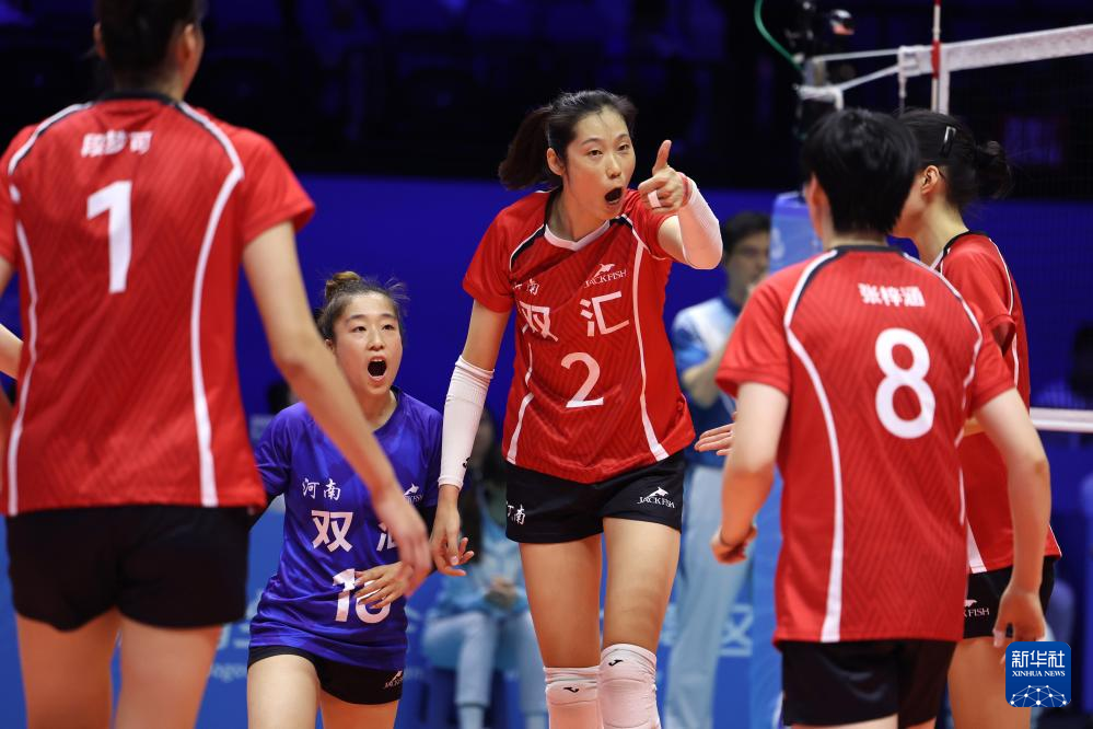 11月12日,河南队球员朱婷(中)在球队得分后向队友竖起大拇指庆祝。