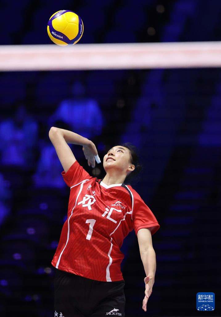 11月12日,河南队球员段梦可(中)在比赛中发球。