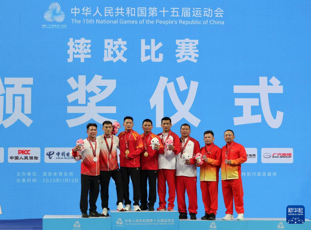 11月12日,获得冠军的江西队选手黎磊(左三)、获得亚军的甘肃队选手呼斯乐吐(左二)、获得季军的安徽队选手田企业(右四)、获得季军的新疆队选手托尔巴图(右二)和教练在颁奖仪式上合影。