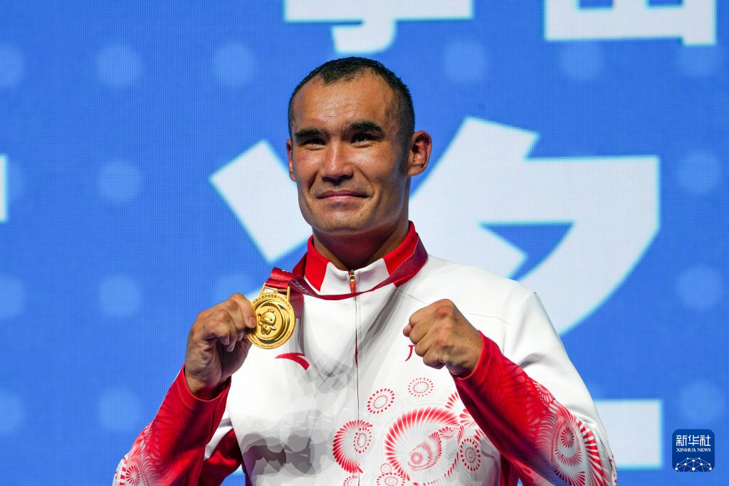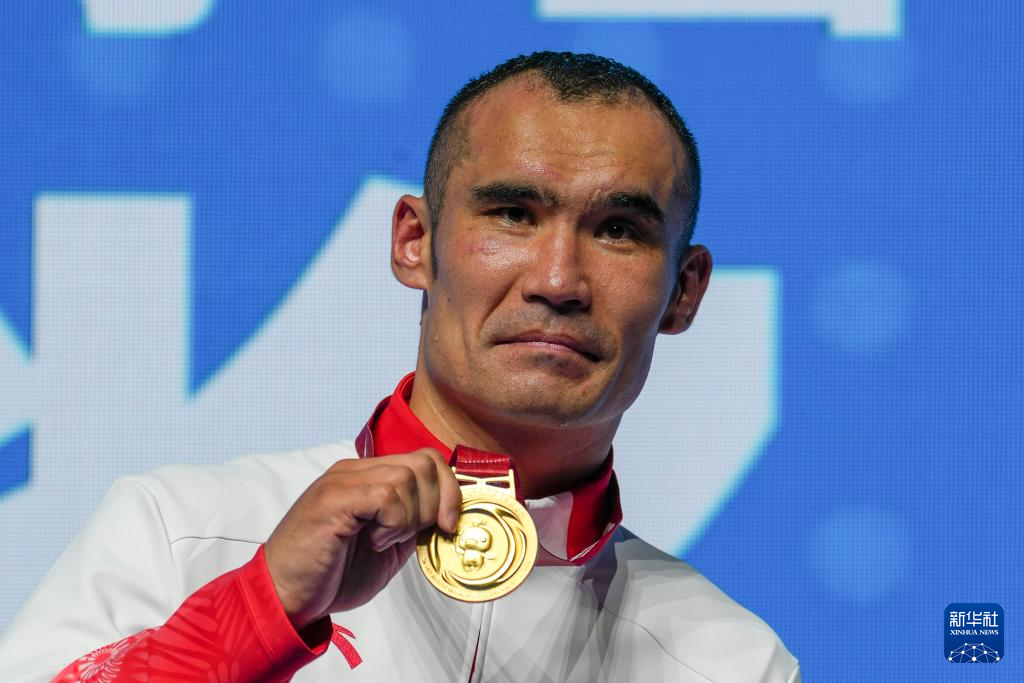 11月12日,冠军巴依克吾孜·达那别克在颁奖仪式上。