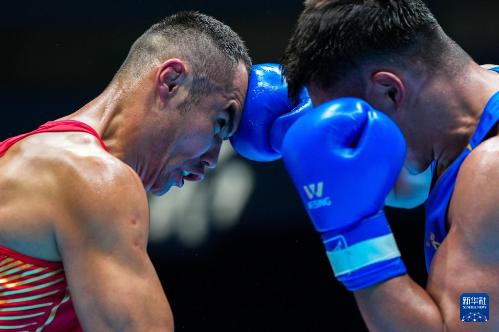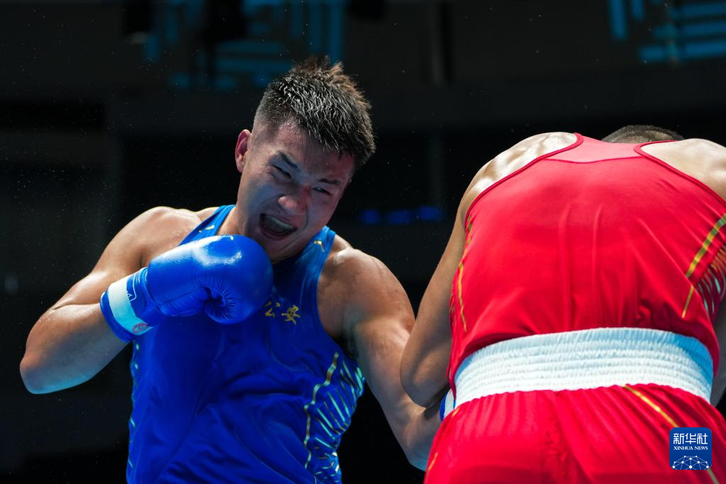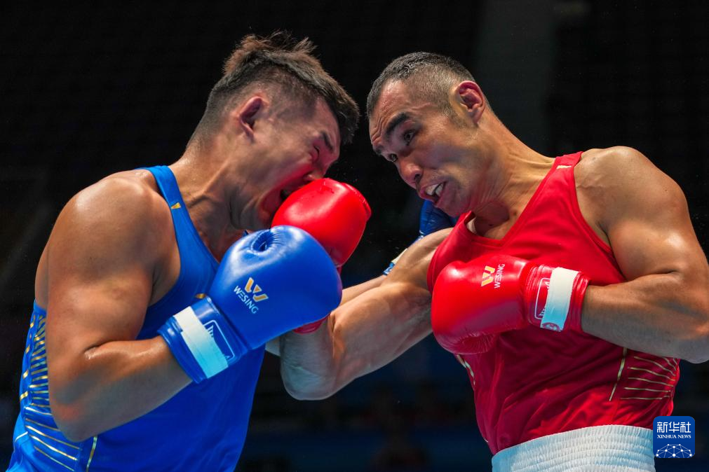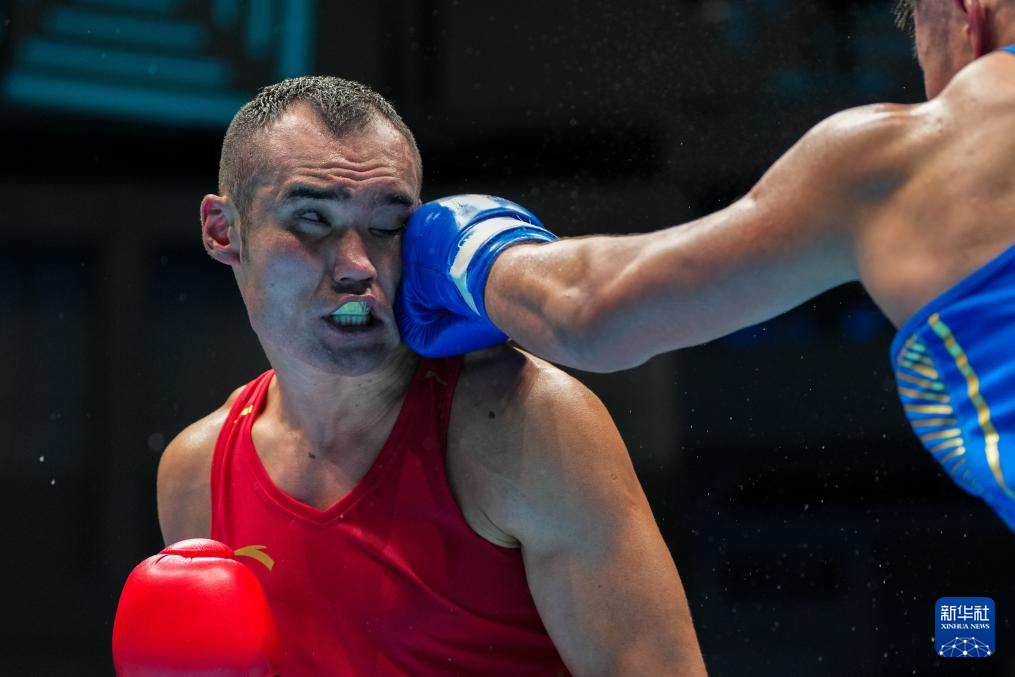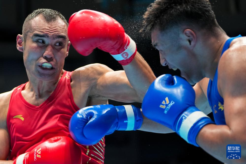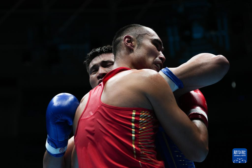11月12日,巴依克吾孜·达那别克与马金阳(左)在比赛中。