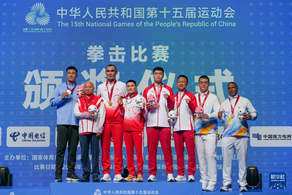 11月12日,冠军广东队选手巴依克吾孜·达那别克(左三)、亚军中国公安体育协会队选手马金阳(左一)、季军山东体育学院队选手赵龙凯(右四)、煤矿体协队选手贾浩森(右二)与教练在颁奖仪式上合影。