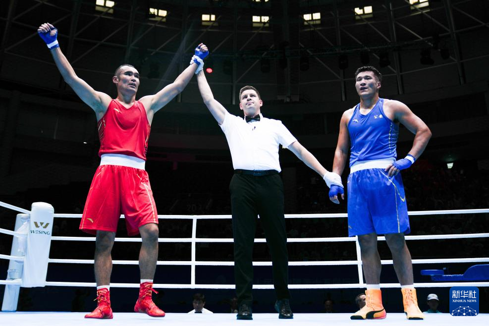 11月12日,裁判宣布巴依克吾孜·达那别克(左)在比赛中取得胜利。