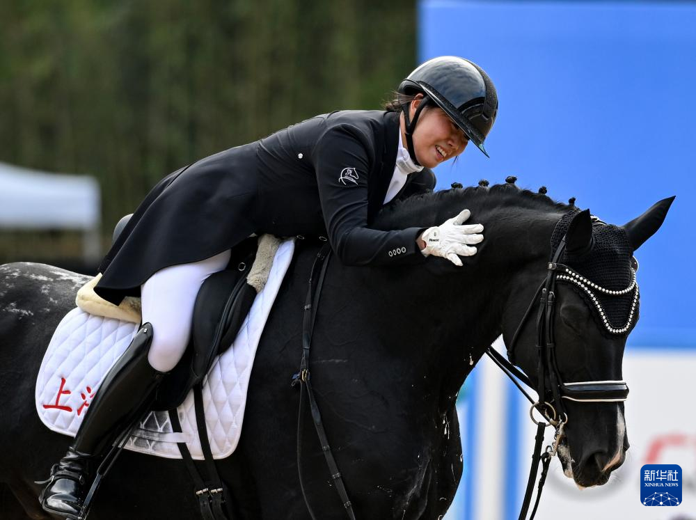 11月12日,上海队选手徐墨菲在比赛后轻拍马匹“好好”。最终她获得亚军。