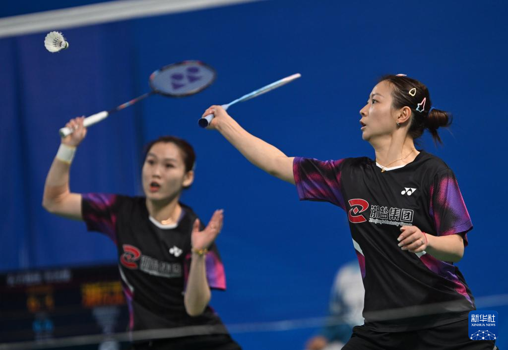 11月12日,浙江队组合黄雅琼/郑岚(右)在女双比赛中回球。她们2比0战胜北京队组合王漪朵/李嘉嘉。