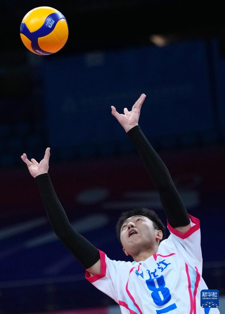 11月12日,浙江队球员宫铭昊在比赛中发球。
