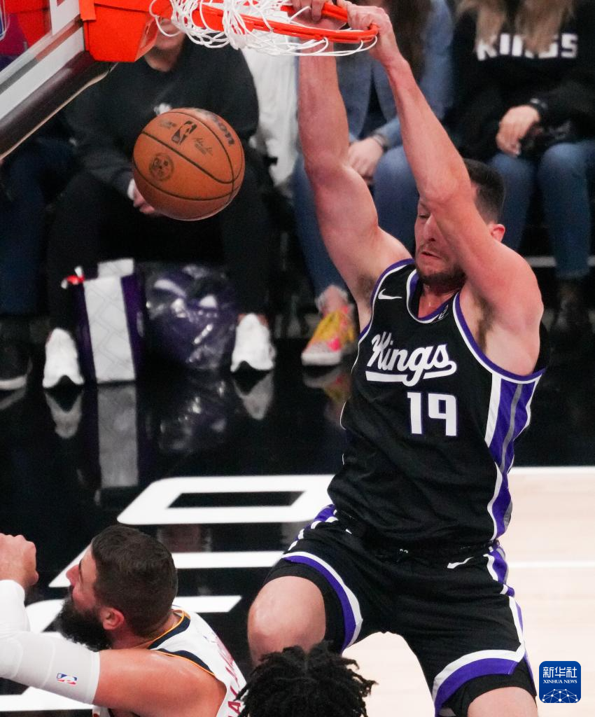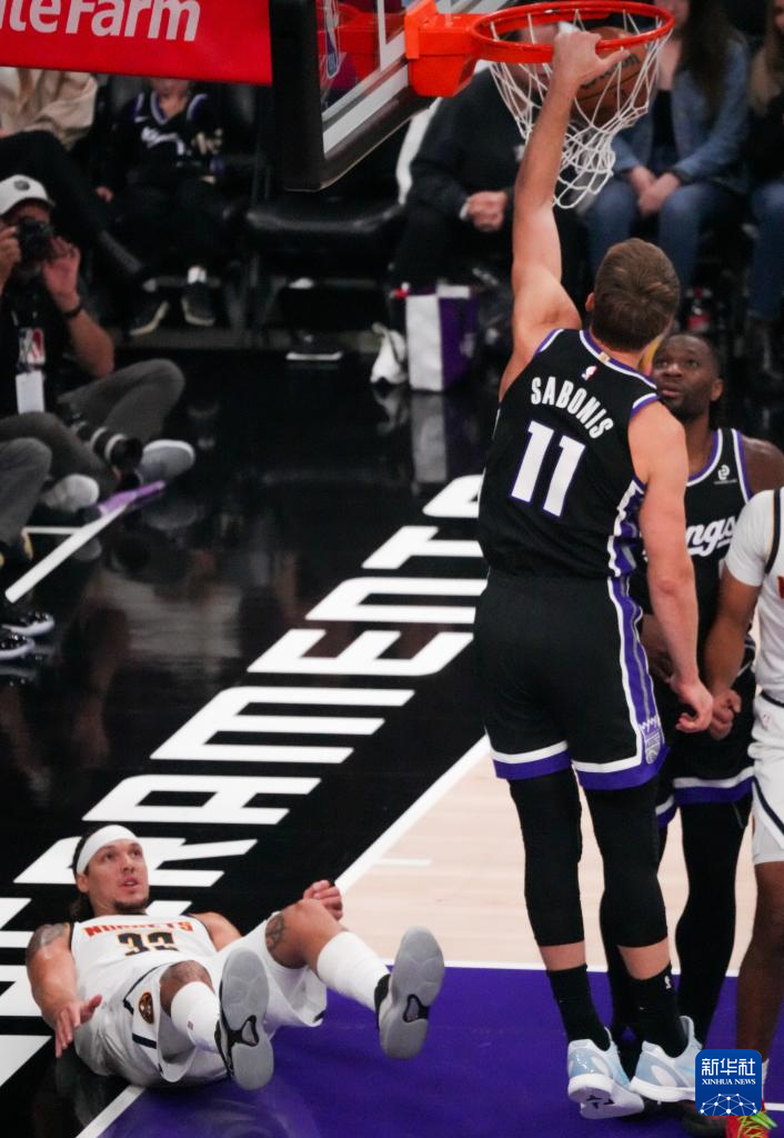 11月11日,国王队球员萨博尼斯(中)在比赛中扣篮。