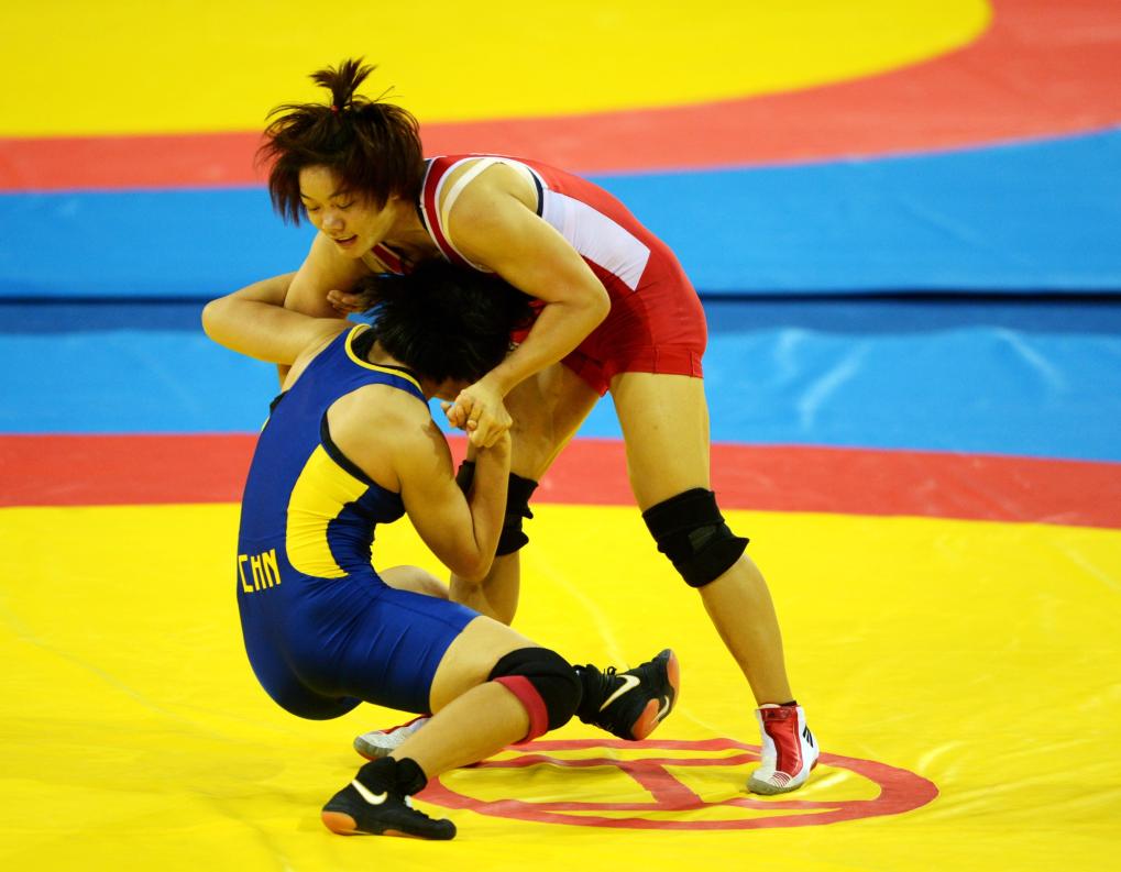 2013年9月8日,在第十二届全运会摔跤比赛女子自由式63公斤级决赛中,湖南选手周倩(上)不敌西藏选手西洛卓玛,获得亚军。新华社记者王松摄