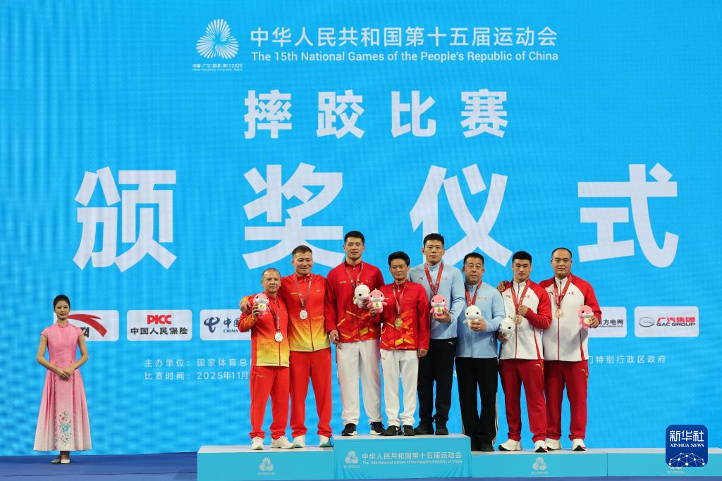 11月13日,获得冠军的重庆队选手李一鸣(台上左三),获得亚军的新疆队选手阿力木拉提·达拉吾拜(台上左二),获得季军的中国公安体育协会队选手童磊杰(右四)、山东队选手郝厚智(右二)和教练在颁奖仪式上合影。