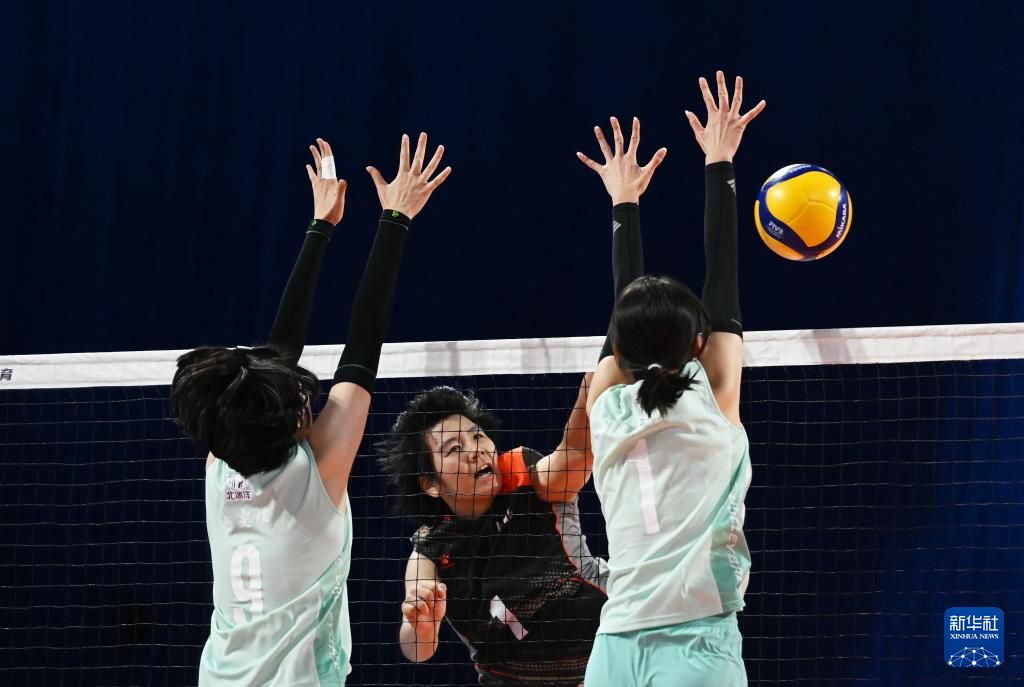 11月13日,北京队选手王程儒在比赛中拦网。