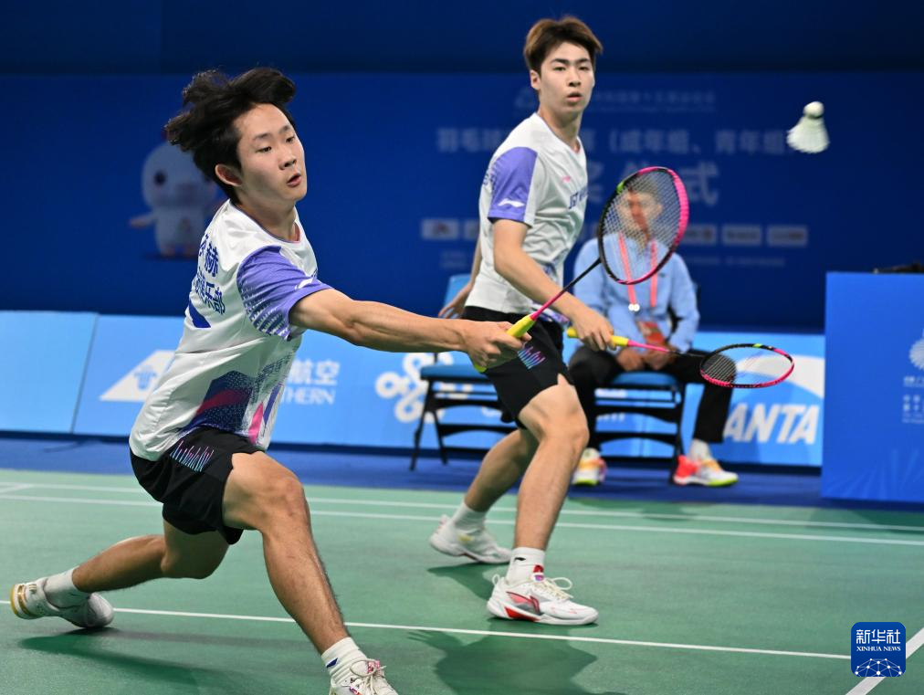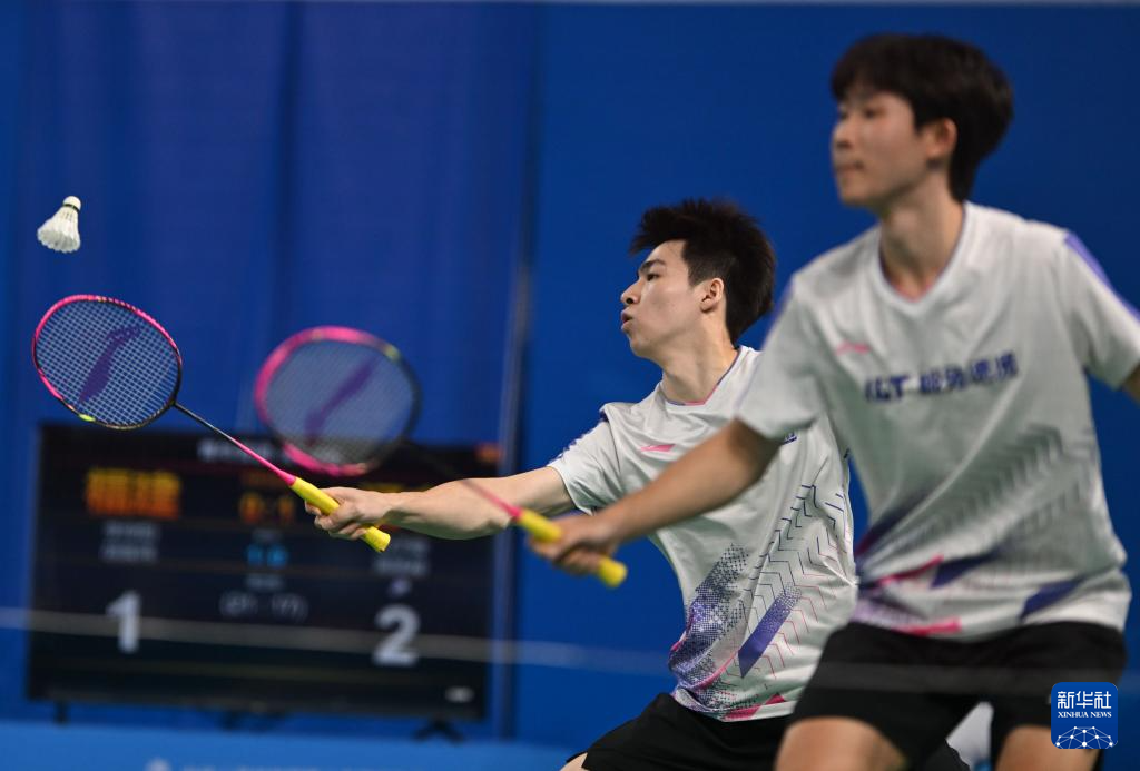 11月13日,辽宁队组合冯子峻/周承赫(右)在男双比赛中。他们2比1战胜福建队组合李仲阳/胡宸玮。