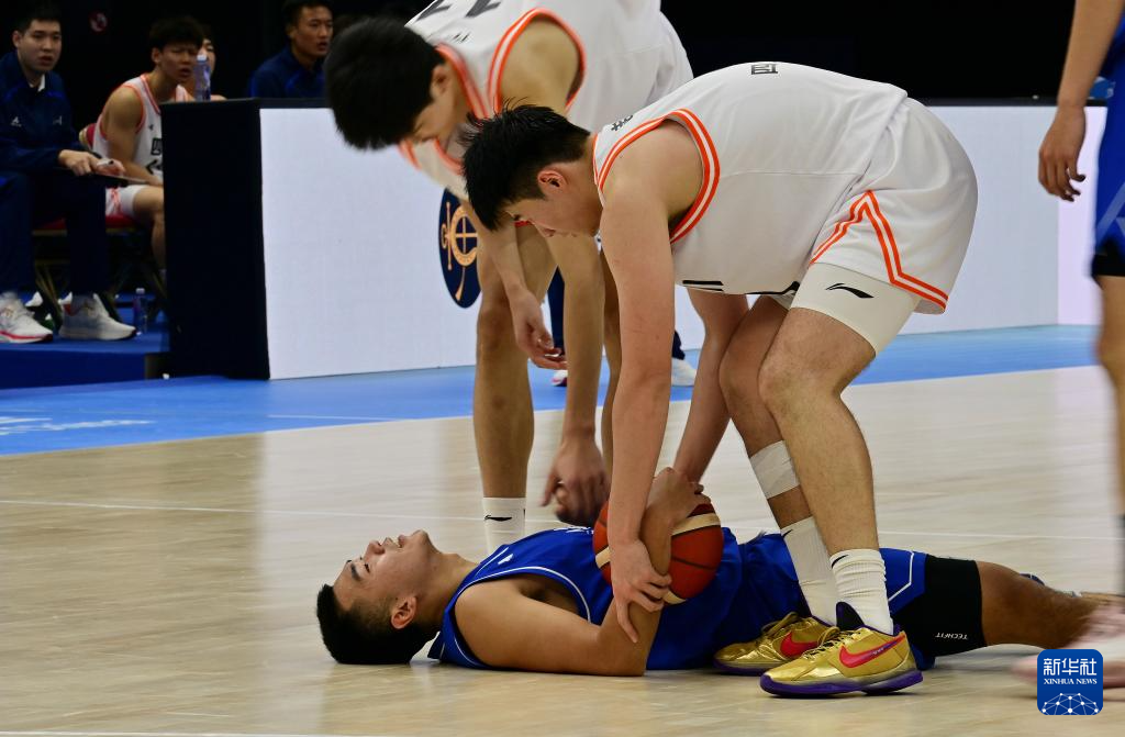 11月13日,四川队球员在比赛中拉起倒地的上海队球员刘梓鹏(下)。