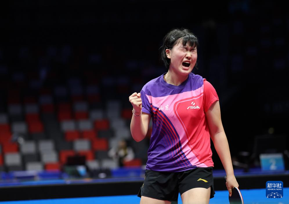 11月13日,山东队选手王馨雅在比赛中庆祝。她在单打比赛中2比3不敌北京队选手杨惠泽。