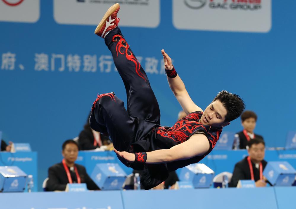 运动员完成腾空飞脚接外摆莲接雀地龙等高难度动作前
