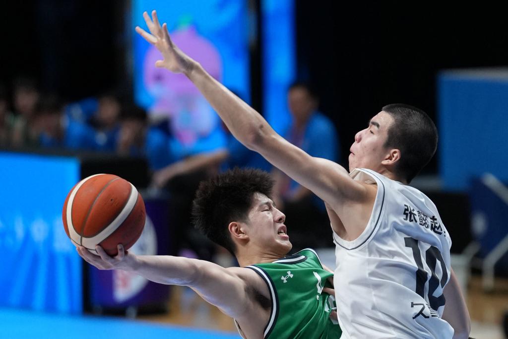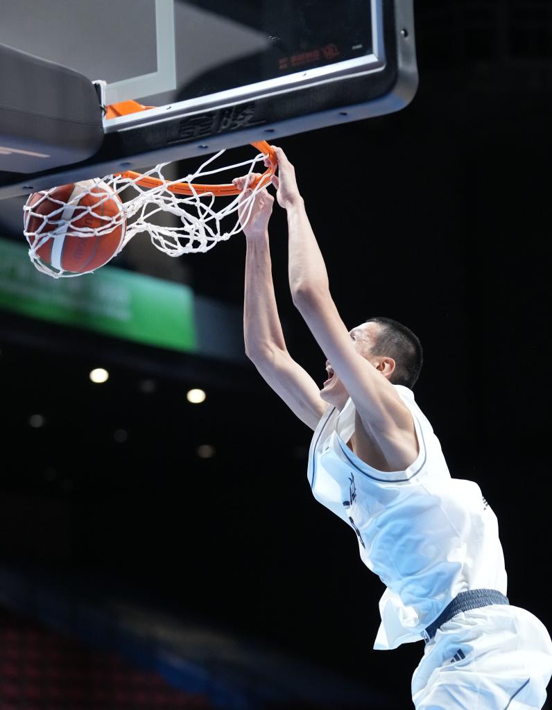 11月10日,上海队球员杨易轩在比赛中扣篮。当日,在澳门进行的第十五届全国运动会篮球项目男子18岁以下组小组赛中,上海队114比67战胜辽宁队。新华社记者 周密 摄