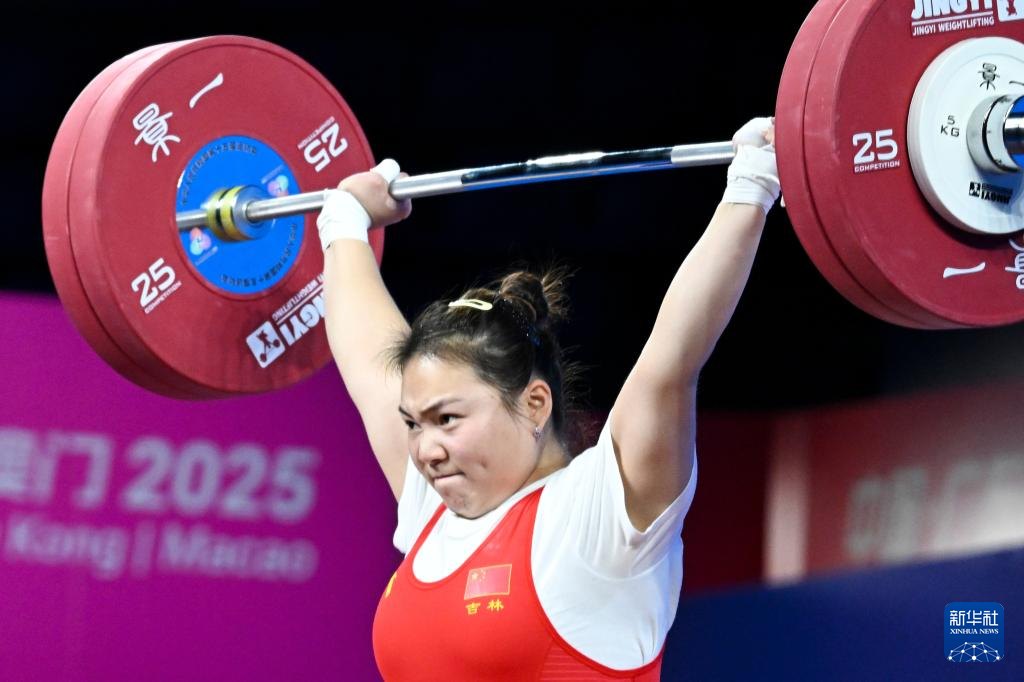 11月13日,吉林队选手李梦凡在抓举比赛中。