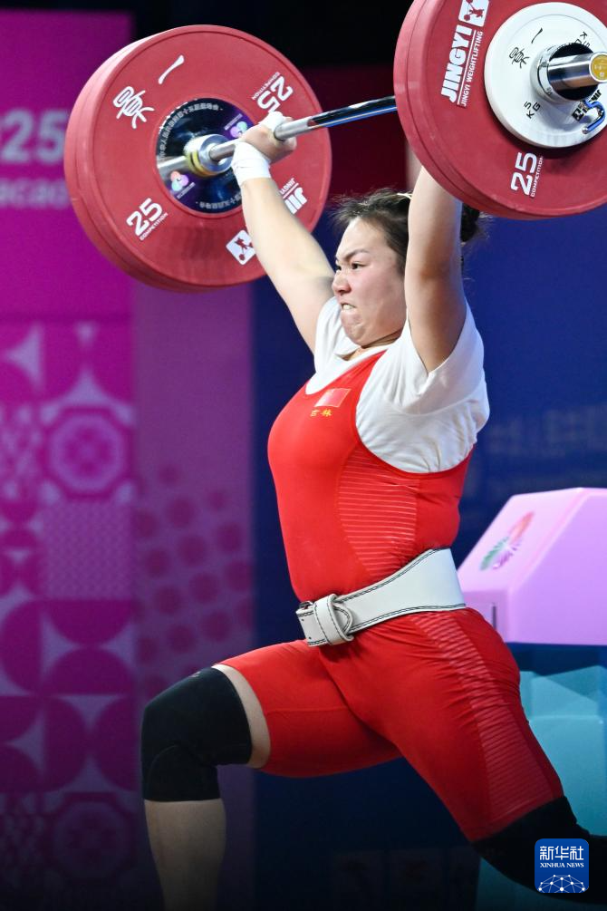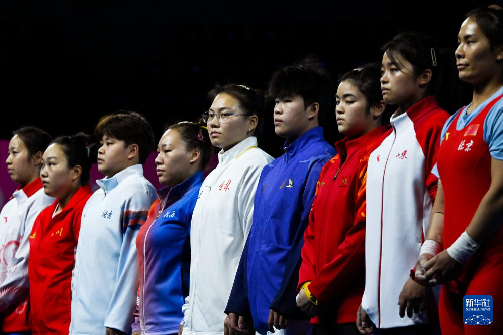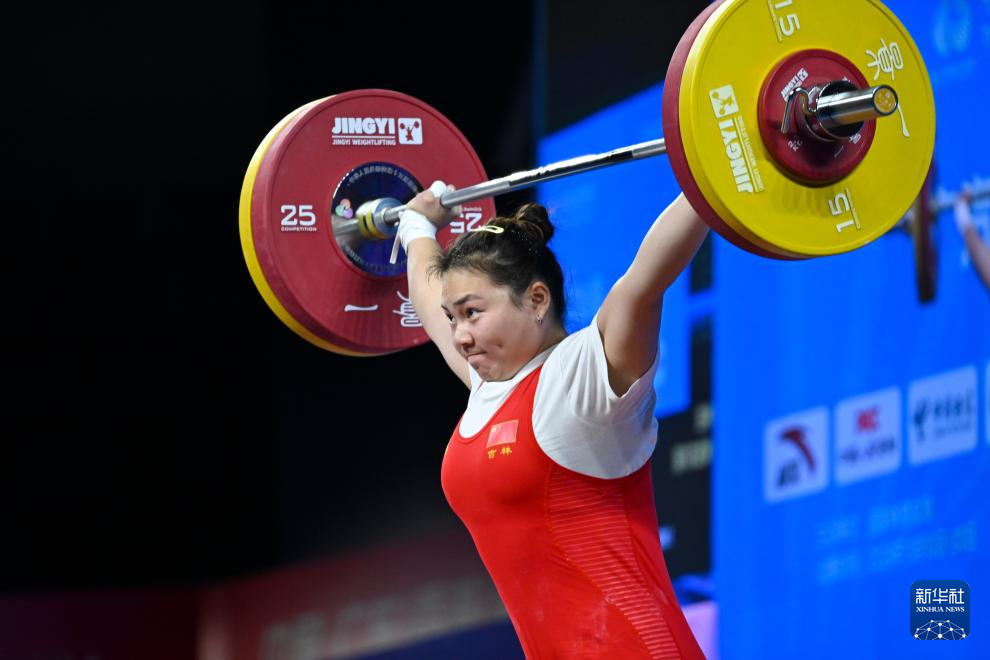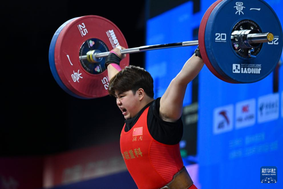 11月13日,湖南队选手覃丽蓉在挺举比赛中。