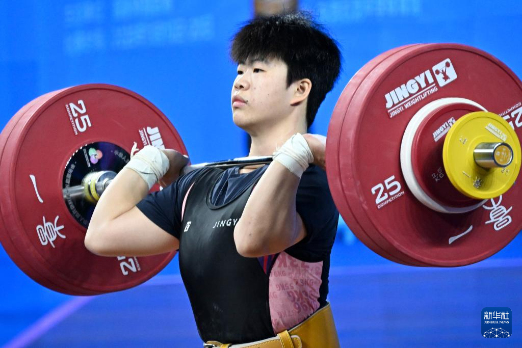 11月13日,湖南队选手覃丽蓉在抓举比赛中。