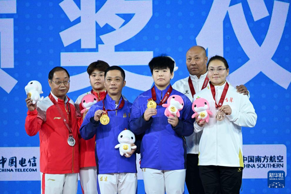 11月13日,冠军福建队选手廖桂芳(右三)、亚军湖南队选手覃丽蓉(左二)、季军吉林队选手李梦凡(右一)在颁奖仪式上和教练合影。