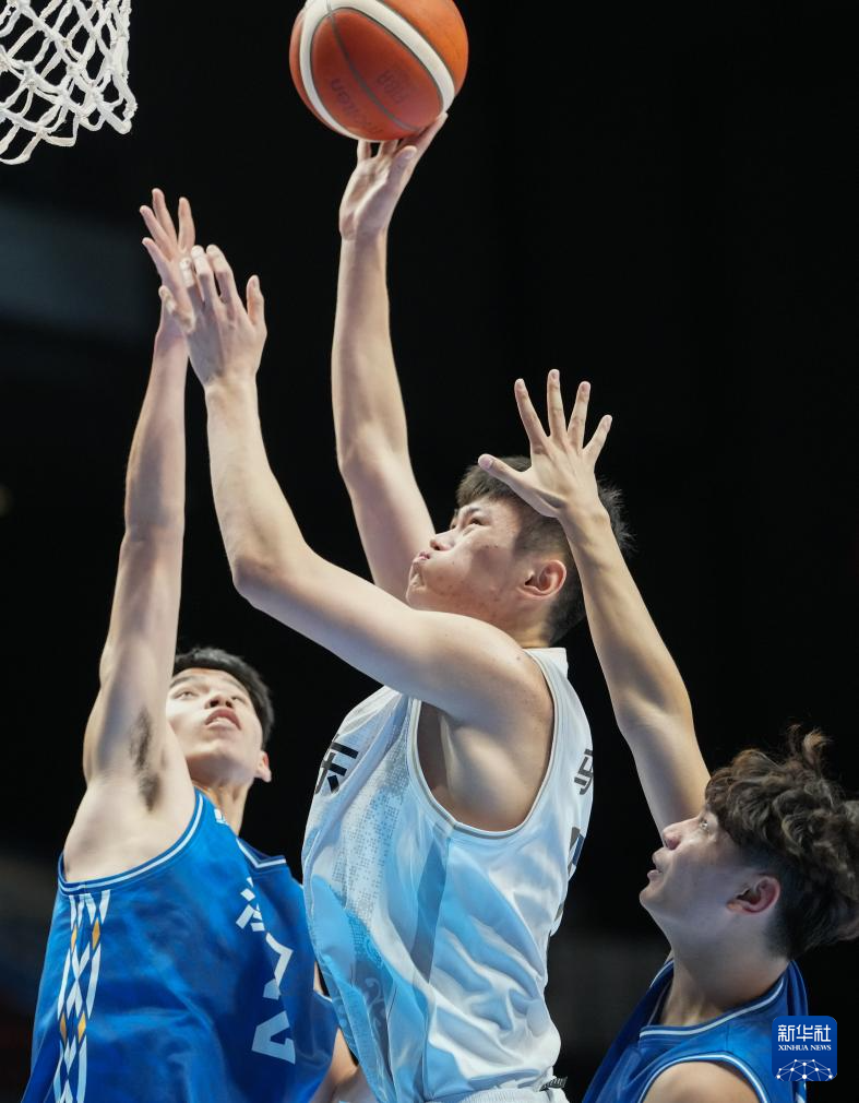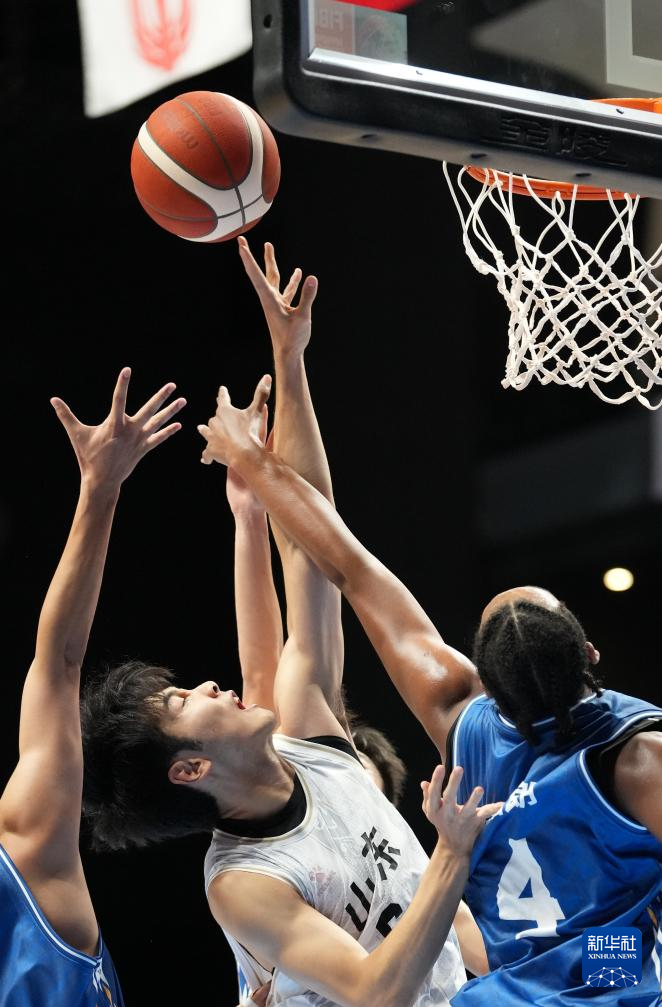 11月12日,山东队球员张博源(中)与澳门队球员麦浩朗争抢篮板球。