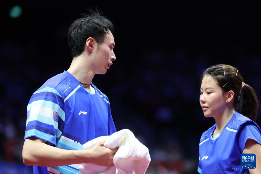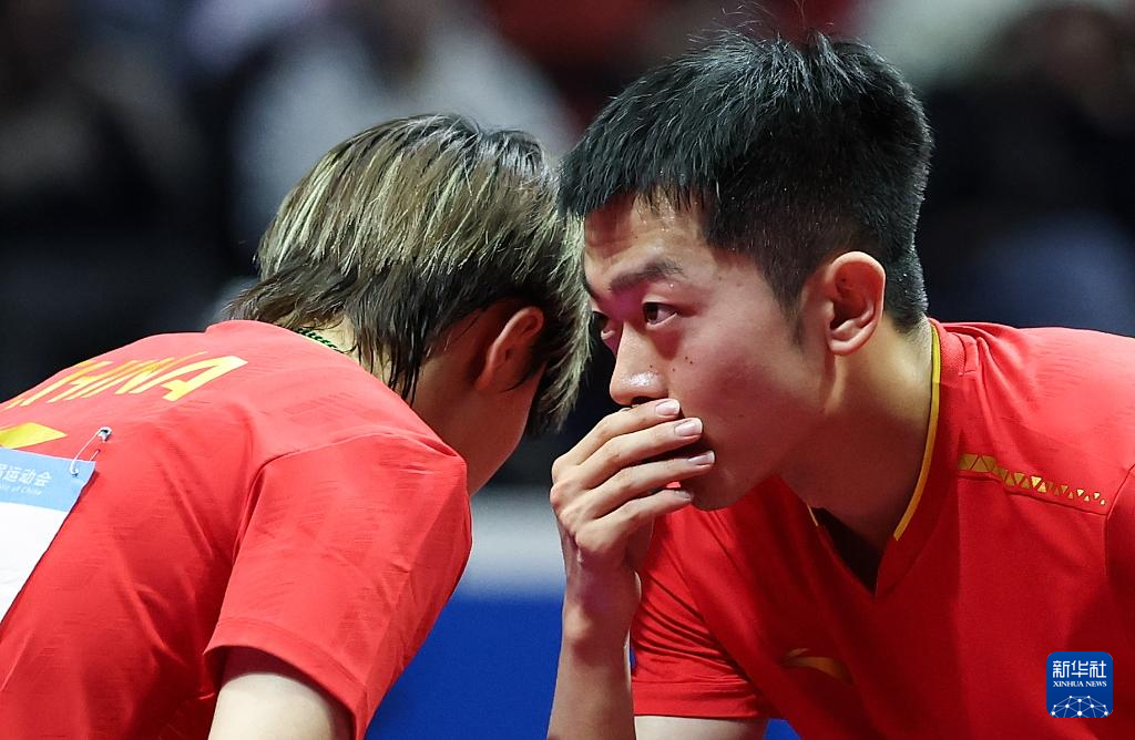 11月14日,辽宁队组合徐海东(左)/陈幸同在比赛间隙交流。