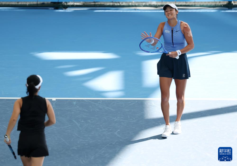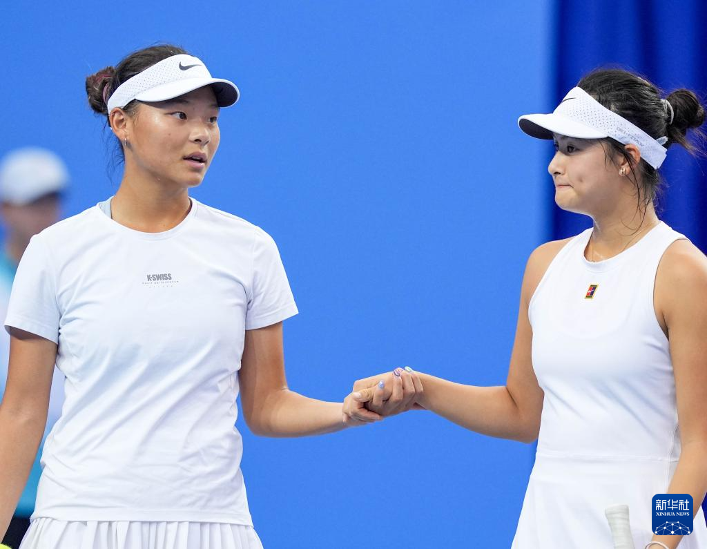 11月14日,天津队组合王曦雨/徐一璠(右)在比赛中。最终,她们2比0战胜安徽队组合邓沛恩/林奕爽,晋级下一轮。