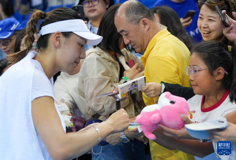 11月15日,广东队选手王欣瑜在比赛后给小朋友的吉祥物“乐融融”上签名。