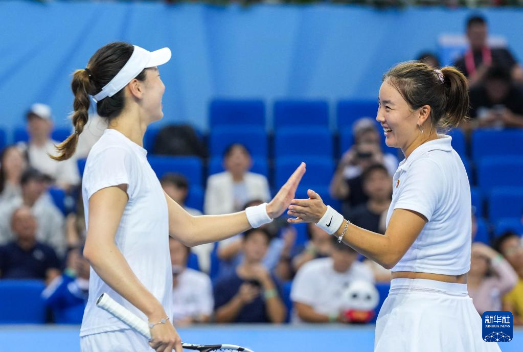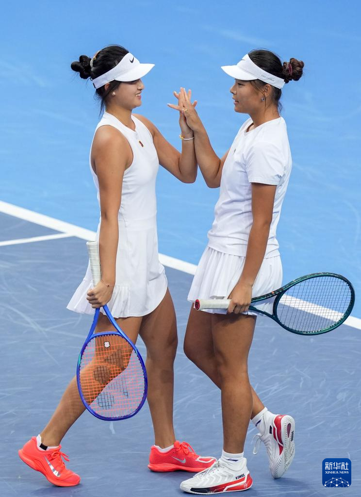 11月14日,天津队组合王曦雨(右)/徐一璠在比赛中庆祝得分。最终,她们2比0战胜安徽队组合邓沛恩/林奕爽,晋级下一轮。