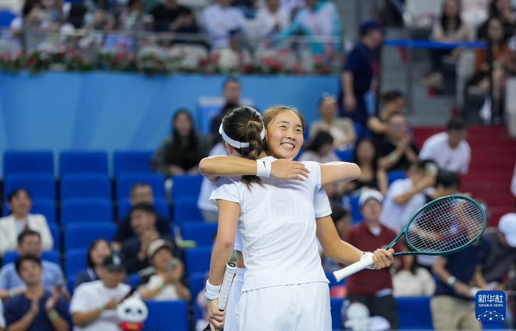 11月15日,广东队组合王欣瑜/袁悦(右)在比赛后拥抱。她们2比0战胜上海队组合葛玲佑/史金灵。